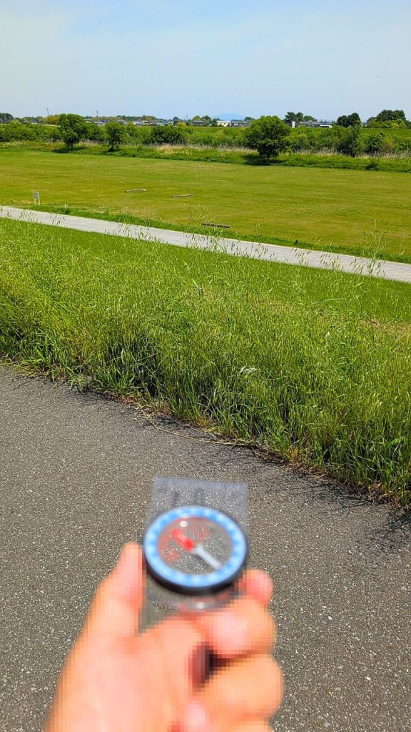 ここ「松伏休憩所」から筑波山女体山までは 39度 でした。それを実際に測ってみることで、この場所が磁気的にクリーンであるか、また各コンパスが具合良く動いてるかを確認します。