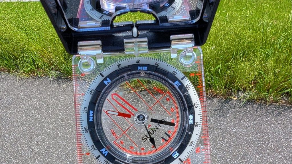 このとき、ミラーがカプセルを真上から映していて、ミラーの中心線が針の中心を通っていれば、コンパスは設定した方位に正確に向き、自分の目も正しい位置にあり、ノッチ(溝) でその方位を照準できます。