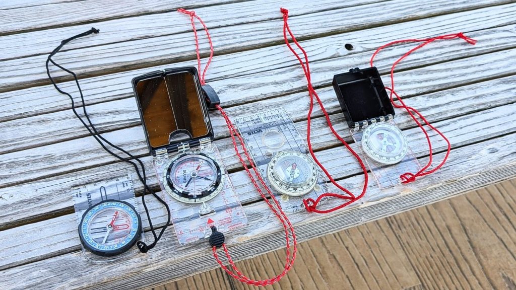 残りの2モデルは、どちらもカプセル内に方位磁針を貼り付けた回転分度器が入っていて、コンパス本体が 360度 どこを向いていても回転分度器は方位角(磁方位)通りに向いてるタイプです。レンズを覗くと照準線と分度器の目盛が読めます。前出の SUUNTO MC-2 とは違うタイプですが、こちらもサイティングコンパスです。