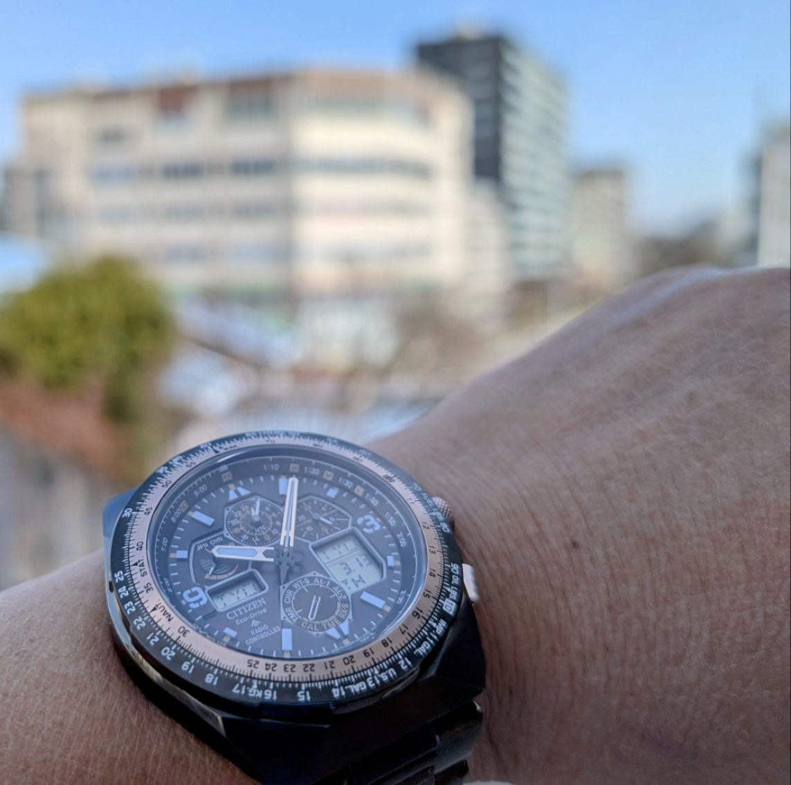 パイロットウォッチを買いました。ストップウォッチと円形計算尺が付いています。この時計で飛行機のナビを気取って、楽しくウォーキングしたいと思います。